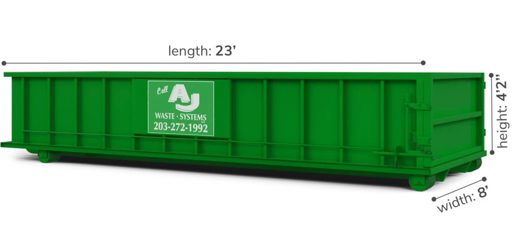 The 20-yard roll-off container is widely considered the “workhorse” of the waste industry due to its ideal balance of high capacity and a manageable footprint. It is the most requested size for both residential and commercial projects, offering enough volume to handle substantial debris without requiring the excessive space of a 30 yard roll off container. AJ Waste Systems offers two types of 20 Yard Container. 20 Yard “Hook” Container, has the footprint of one parking space and is about 6.5 feet tall, and the 20 Yard Roll Off as displayed.
